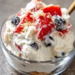 This dish uses cream cheese, powdered sugar, vanilla, cool whip, berries, and graham crumbs. It feels like a no-bake cheesecake in a bowl. You do not need an oven. It stays cool and fresh.