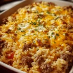 A delicious and comforting one-dish meal featuring ground beef, rice, and melted cheddar cheese, perfect for families or gatherings.