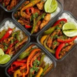 - Divide cooked rice or quinoa into meal prep bowls, top with chicken fajita mixture, and add optional toppings as desired.