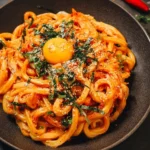 A comforting bowl of creamy gochujang udon noodles, blending Japanese and Korean flavors into a delicious fusion dish.