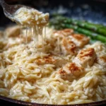 Creamy Parmesan Orzo is a warm, simple dish. Small pasta cooks fast and soaks up a rich, cheesy sauce. You get tender chicken and fresh asparagus in a smooth, creamy mix. It is easy to make for weeknights and tastes like comfort food.