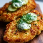 Serve the Crispy Dill Pickle Parmesan Chicken hot, with your favorite sides such as mashed potatoes, coleslaw, or a fresh garden salad. You can also serve it with extra dipping sauce on the side, such as ranch or a creamy dill sauce, for added flavor.
