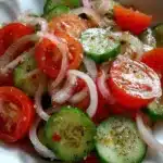 Cucumber, Onion, and Tomato Salad is a no-fuss side dish. The vegetables stay crisp, and the sweet-tart dressing brings them together. You do not need special tools or long cooking. This salad works for family dinners, picnics, or a quick lunch.