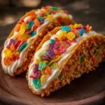 Serve Fruity Pebbles Cheesecake Tacos as a fun dessert at parties or family gatherings. They can be enjoyed right away for a soft texture or chilled for a firmer delight. Garnish with a few extra pieces of fruity cereal on top for a pop of color and crunch. These tacos can also be paired with ice cream for an even sweeter combination.