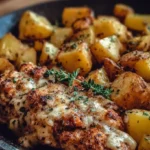 A delicious and easy meal combining juicy chicken with tender, crispy potatoes, seasoned with garlic and Parmesan cheese.