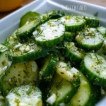 A fresh and light salad featuring thin cucumber slices soaked in a zesty lemon-dill dressing.