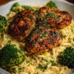 Lemon pepper chicken served with broccoli and orzo pasta, garnished for a delicious meal.