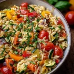 A colorful and wholesome dish combining vibrant vegetables and orzo pasta, perfect for weeknight dinners or gatherings.