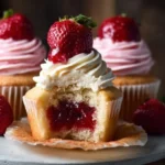These strawberry jam filled cupcakes are soft, sweet, and easy to make. The cake hides a small spoon of jam in the middle. A smooth cream cheese frosting and a hint of strawberry make each bite bright and fresh. This recipe uses simple ingredients you may already have.