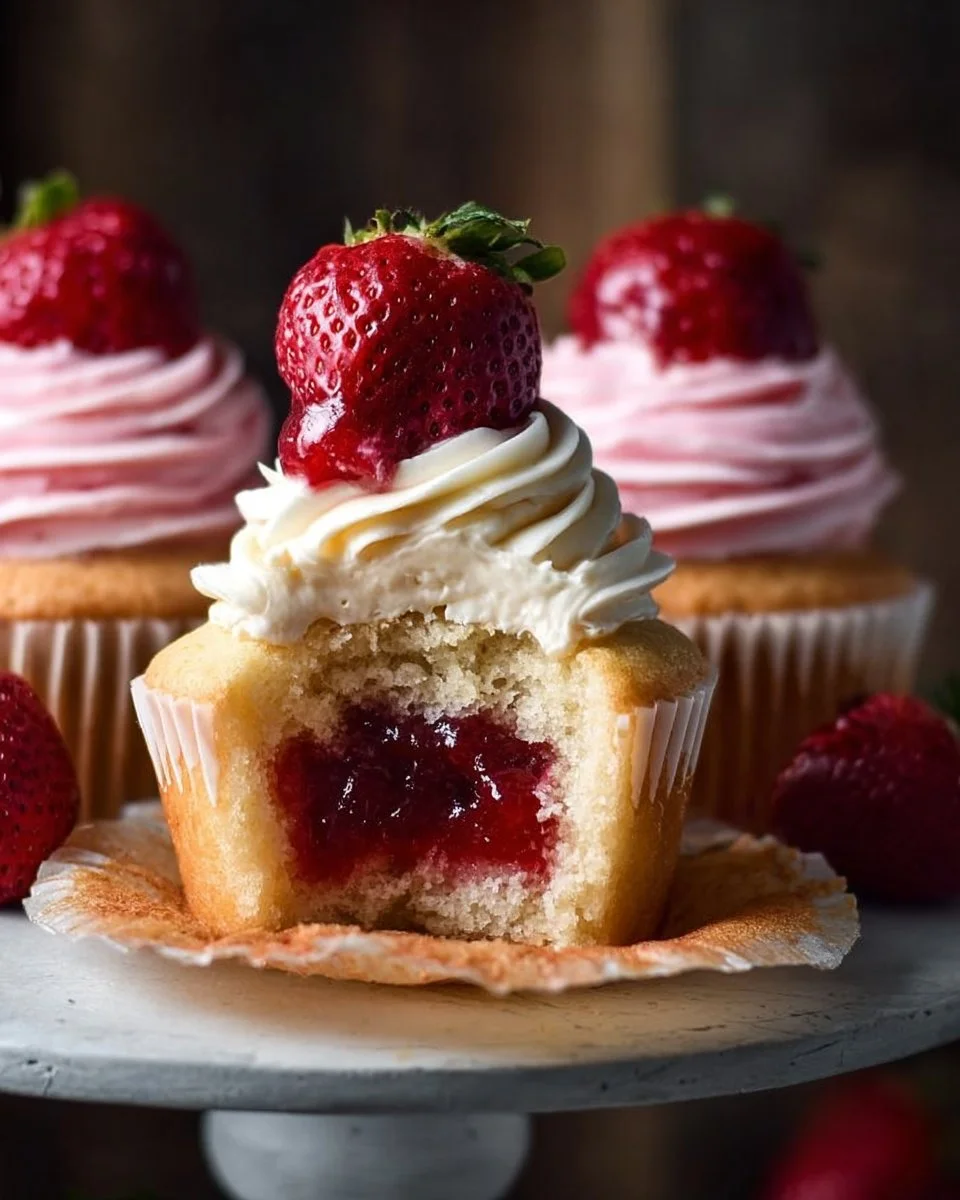 These strawberry jam filled cupcakes are soft, sweet, and easy to make, with a delightful jam center and cream cheese frosting.