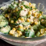 A vibrant and refreshing salad combining crisp cucumbers, sweet corn, and rotisserie chicken, all brought together with a creamy yogurt dressing.