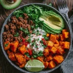 Once the sweet potatoes are done and the beef is cooked, it’s time to assemble your bowls. Divide the roasted sweet potatoes into serving bowls. Top each bowl with ground beef, pico de gallo, guacamole, and a dollop of sour cream. If you want to add an extra splash of color, consider garnishing with chopped cilantro, lime wedges, or crumbled cheese.