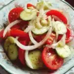 A fresh and quick salad featuring tomatoes, cucumbers, and onions with a light, tangy dressing.